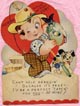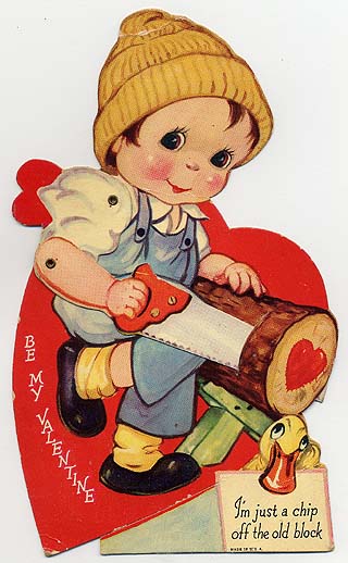 Item# VAL432: MECHANICAL LUMBERJACK VALENTINE. If your loved one loves his chainsaw, this is the valentine for him(or her)! Little boy saws a log embedded with a heart. A duck holds a sign that says, "I'm just a chip off the old block." Move the heart behind the boy's arm and he saws the log. 8 inches high. Inscribed on back. Very good condition, with a crease on his hat, and a small crease down at the bottom. Made in USA, C. 1939. SOLD.
