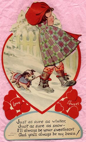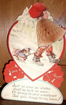 Item# VAL65: GIRL WITH DOG HONEYCOMB VALENTINE. This one features a little girl walking her terrier in the snow. The dog is wearing a doggie coat, and the girl is wearing a bright red hat and a plaid rain cape. Open the cape to reveal the HONEYCOMB. The base says, "Just as sure as winter, Just as sure as snow, I'll always be your sweetheart, And you'll always be my beau!" 8 1/4 inches high, Made in Canada. Slight bends near the top; otherwise in excellent condition. Signed in ink on the back. Dated 1944. SOLD.
