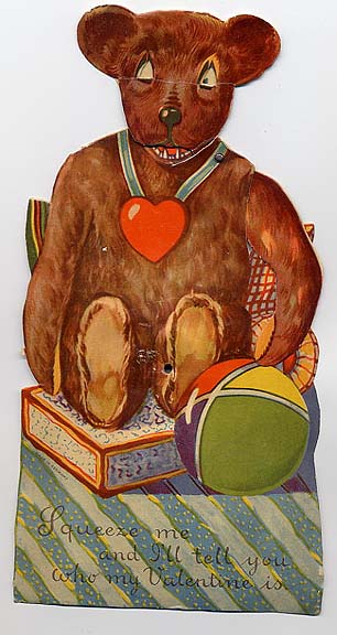 Item# VAL703: SQUEAKY BEAR VALENTINE. This fellow wears a heart around his neck, but move his arm and he can go from sweet and flirty to teeth-baring scary in an instant. And he has a working squeaker in his tummy. You should have heard the racket he made when we closed the cover of the scanner! The caption says, "Squeeze me and I'll tell you who my valentine is." He's also a mechanical, so if you move his arm, his eyes move. Self-easel in the back. He's a big one - 8 3/4 inches tall! He's got a faint crease that goes across his eyes, but is in overall very good condition. Unused. Made in Germany circa 1900s. SOLD.