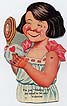 Item# VAL704: GIRL WITH POWDER PUFF AND MIRROR VALENTINE. For your friend who is always checking herself in the mirror. This girl seems to be pleased with what she sees. She's holding up a hand mirror, and is smiling at her reflection. The puff in her hand is adorned with a heart and the words, "Valentine Greetings". Move her hand and the puff rises up to her face. The caption says, "I'm just 'Making Up' my mind to be your Valentine." In overall very good condition, with a faint crease in her hair - only visible when the light is at the right angle. Inscription on back. Made in USA. 1928. $12.00.