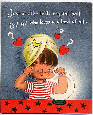 Item# VAL708: GREAT CHARACTER VALENTINE. This valentine features Butch, a character produced by Norcross cards, out of business since the early 80s. It features Butch on the front, in a turban with a crystal ball surrounded by valentines and question marks. It says, "Just ask the little crystal ball, It'll tell who loves you best of all-. Inside, it says, "YER MUDDER!" over a picture of Butch barely tolerating a kiss from his Mom. This is a great one to send your son! 5 inches high, unused, tiny amount of paper loss on the back, barely visible. Made in USA circa 1940s. $6.00.
