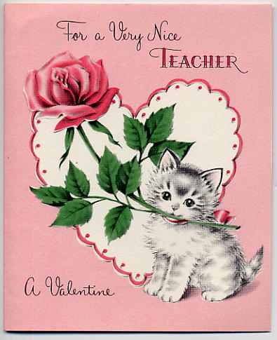 Item# VAL710: TEACHER'S VALENTINE.Remember the days when every child brought a valentine for the teacher? Nowadays, our harried teachers could use a nice gesture like a valentine. This one features a kitten holding a rose in its mouth The front says, "For a Very Nice Teacher, A Valentine." The inside says, "You're one of the nicest teachers I know, And this Valentine comes to tell you so!" 5 inches high, made by Norcross, a company out of business since the early 80s. In pristine condition, unused, it even comes with the original envelope. Made in USA circa 1950. $5.00.