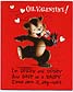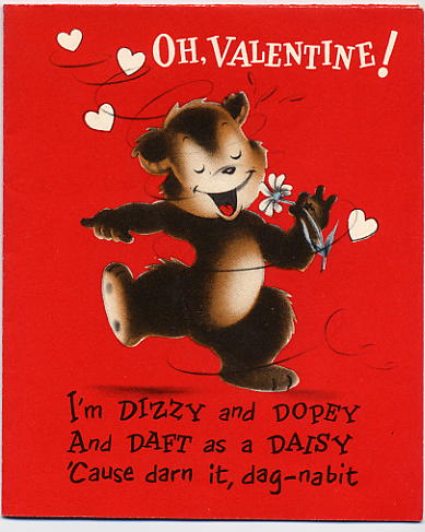 Item# VAL711: DIZZY BEAR VALENTINE. A bear who is obviously in love smells a daisy as it spins in circles. Front says, "Oh Valentine! I'm dizzy and dopey and daft as a daisy, 'Cause darn it, dag-nabit," ... the inside says, "I love ya like crazy!" 5 inches high, pristine, never used, made by Norcross, a company out of business since the early 80s. Made in USA< circa 1950. $4.00.