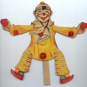 Item#VAL199: UNIQUE CLOWN VALENTINE. This valentine doubles as a toy. Pull on the stick and he becomes a jumping jack. Not only that, his head flips up too! This valentine has been professionally restored and is in excellent condition with one crease across the clown's face. $125.00.