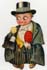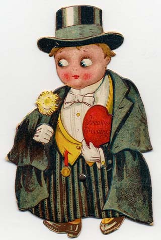 Item# VAL903: MECHANICAL RUNNING BOY IN FORMAL EVENING ATTIRE VALENTINE. This young man in cape, tophat, white tie and spats, even sports a pocket watch! He carries a heart that says, "Valentine Greetings". His feet are on a wheel, so you can make him "run" across a table top. Unused. Slight wear on tips of cape, but overall in very good+ condition. Approximately 4 inches high. German, C. 1900. SOLD.